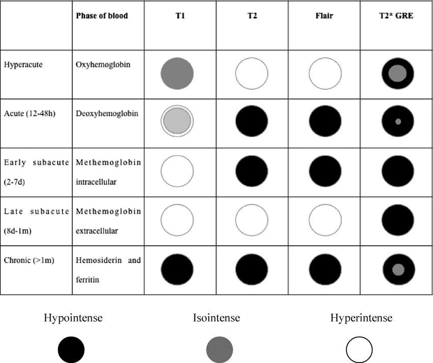 Appearance of intracerebral hemorrhage on MRI by stageData from Kidwell CS, Chalela JA, Saver JL, et al. Comparison of MRI and CT for detection of acute intracerebral hemorrhage. JAMA 2004;292:1823–30; and Wijman CA, Venkatasubramanian C, Bruins S, et al. Utility of early MRI diagnosis and management of acute spontaneous intracerebral haemorrhage. Cerebrovasc Dis 2010;30:456–63. Image from Domingues, Renan & Rossi, Costanza & Cordonnier, Charlotte. (2015). Diagnostic uation for Nontraumatic Intracerebral Hemorrhage. Neurologic clinics. 33. 315-328. 10.1016/j.ncl.2014.12.001.